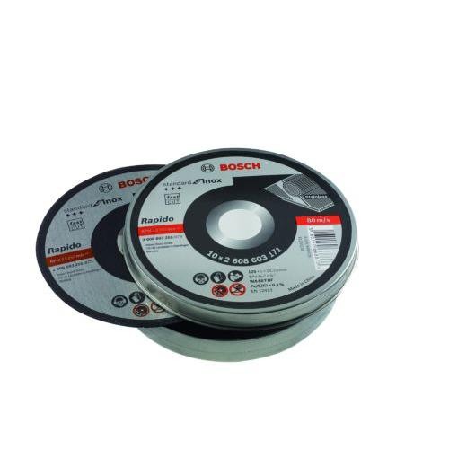 Lata metalica con 10 discos de corte de la gama Standard for para corte de Inox 125 x 1 mm. Cortes limpios, finos y sin rebabas. Gama Standard mas economica. Normativa EN 12143