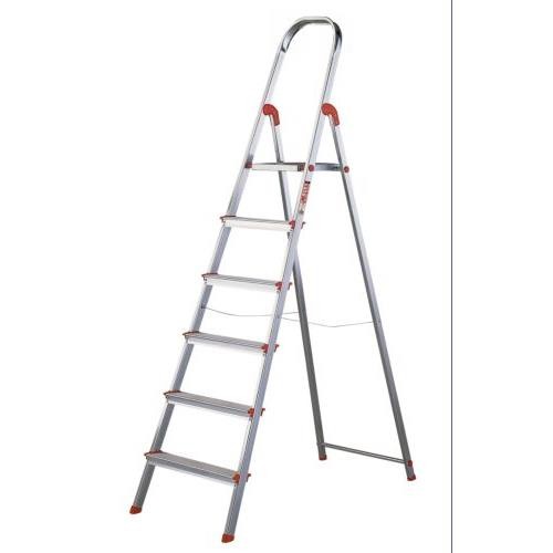 Escalera de aluminio resistente y ligera de 6 peldaños. Componentes: Peldaño extraancho de 120 mm, arco de apoyo con altura de seguridad de 60 cm, peldaños antideslizantes y con sistema de puntos fuertes, rellano con sistema de seguridad y amplia superfic